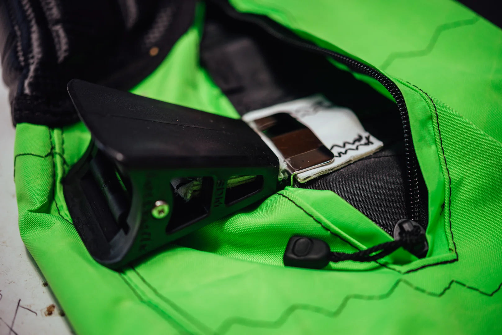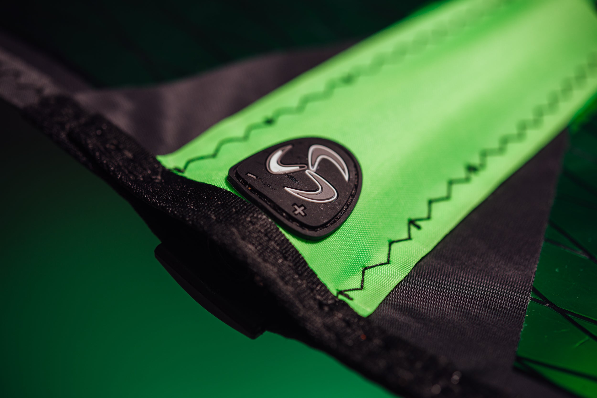 Multiple PVC protectors are distributed across the sails to safeguard critical points from wear. These include a thermoformed mast/board pad, soft PVC protectors for the foot edge and the batten pocket that crosses inside the boom area, and a moulded PVC protector sewn onto the top of the mast pocket.